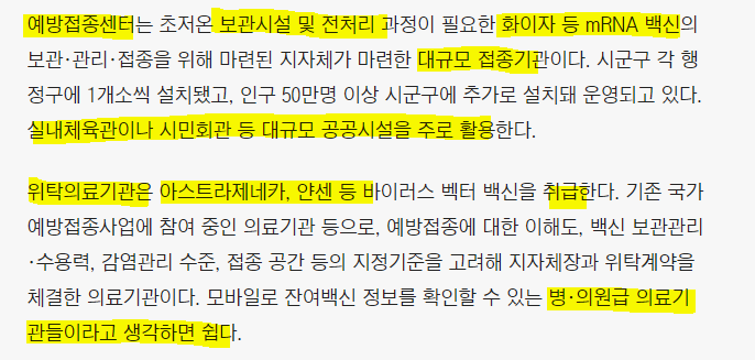 예방접종센터 - mRNA 백신 (화이자, 모더나) 접종가능. 실내체육관이나 시민회관 등 큰 공공시설 활용.