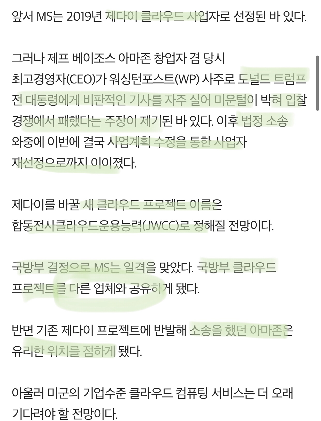 핑계는 프로젝트가 미뤄진동안 사업환경이 변해서 이에 대응하려면 입찰을 다시 해야 한다는건데, 내 뇌피셜은 아마존이 정권 바뀌면서 바로 로비를 열심히 한게 아닐까 싶음(미국은 로비가 합법).