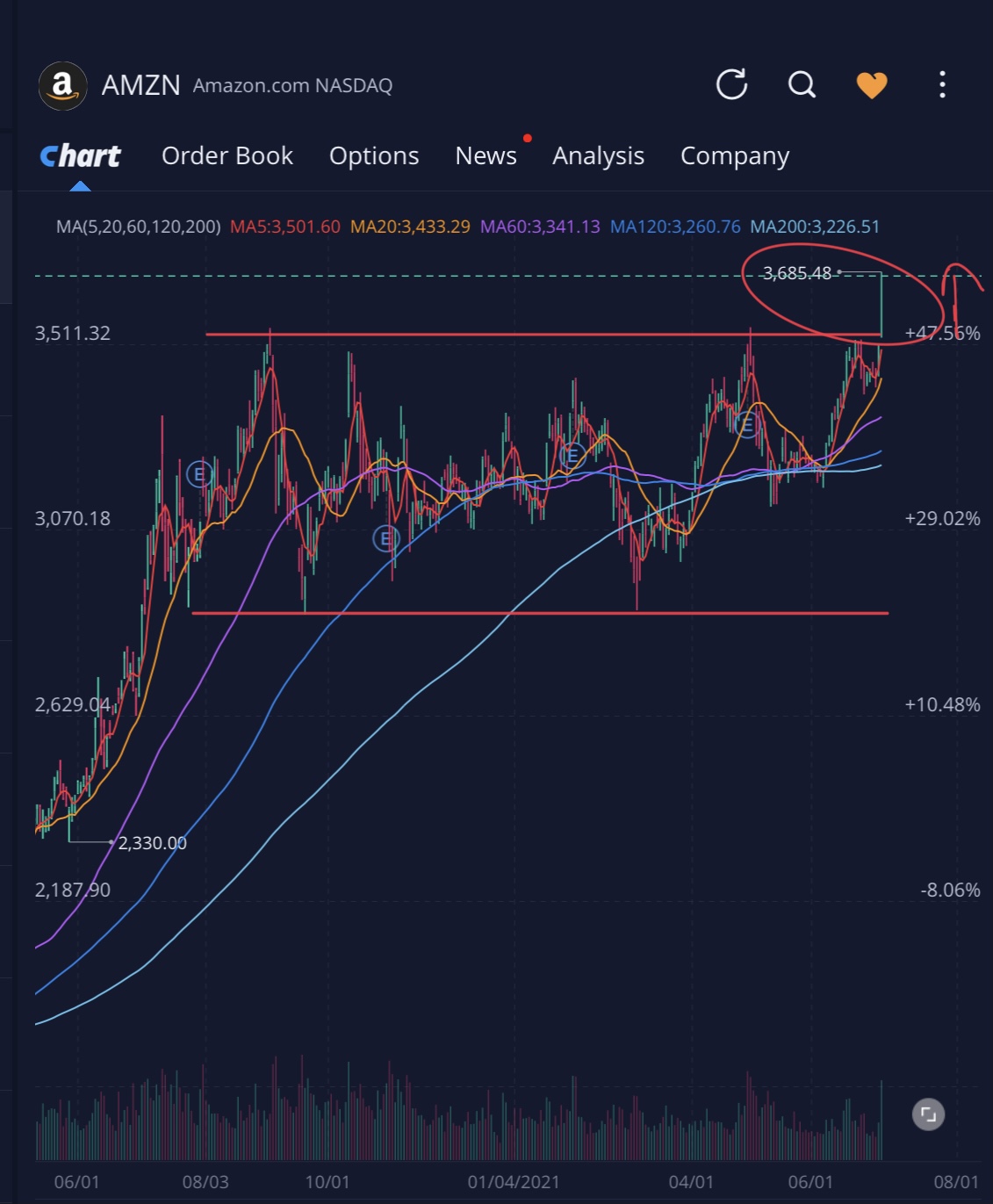 3. 그리고 CEO 제프 베조스 사임으로 액면분할하지 않을까 하는 기대감에 사람들이 열심히 째려보고 있음.