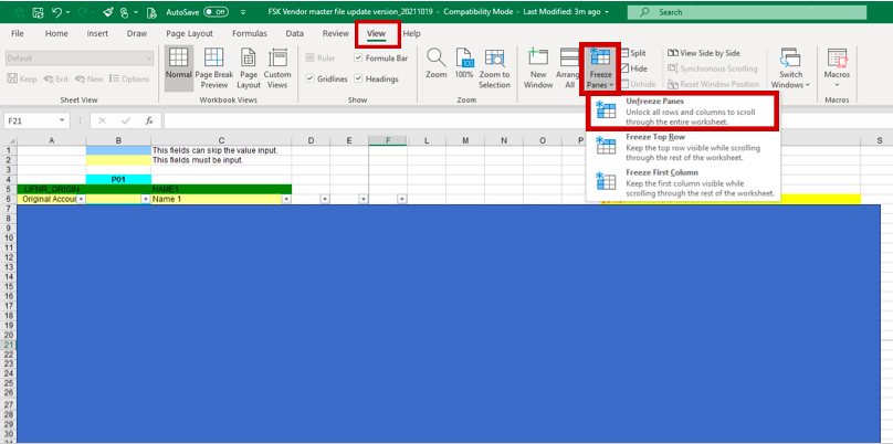 상단 메뉴바의 보기 (view) → 틀고정 (Freeze Panes) → 틀고정 해제 (Unfreeze Panes) 순서로 선택해주면 됨.
