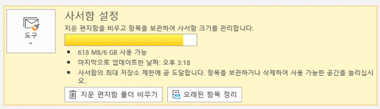 한 3주전에 용량이 다차서 메일을 한번 다 삭제했는데 용량 변화가 없었다... 결국 얼마전에 계속 용량없다고 알림메일이 와서 이번엔 진짜 근본적으로 해결을 해보자! 마음먹고 이리저리 뒤진결과 해결책을 찾았다. 이 해결방법은 마이크로소프트 익스체인지 (Microsoft Exchange )서버에 메일이 연동될 경우 사용가능한 방법이다. feat. 비루한 용량 6GB