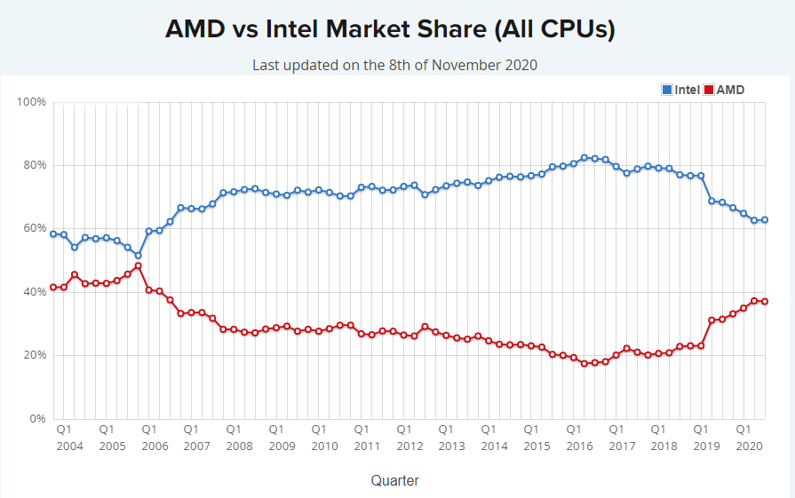 CPU 분야에서 인텔과 AMD 약 60:40 정도. AMD 가 바짝 추격하고 있다.