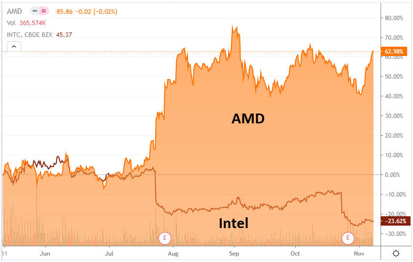 그리고 올해 주가 흐름을 보면 Intel 이 죽쑤고 있는동안 AMD는 고공행진중... 6개월 전보다 62.98 % 상승