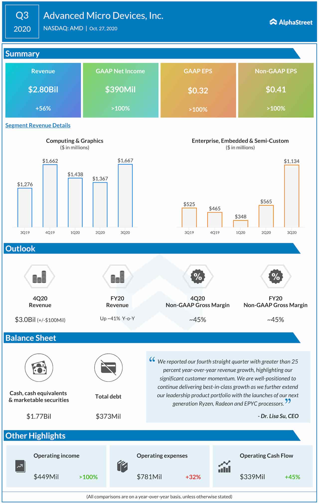 Enterprise, Embedded & Semi-Customs 부문은 116% 상승했다. 마이크로소프트(MS), 오라클 등 대형 업체가 에픽(EPYC) 프로세서를 채택한 덕분이다(*EPYC - AMD 의 서버용 프로세서). 원래 서버용 프로세서는 인텔이 굴지의 강자였으나, 최근 시황이 변해가고 있다. XBox 와 플스 게임 콘솔 판매가 급증한 것이 주효했으나, 게임 뿐만아니라 최근 마이크로소프트의 Azure 와도 협업하며 시장 점유율을 점차 늘려가려고 시도하고 있다.