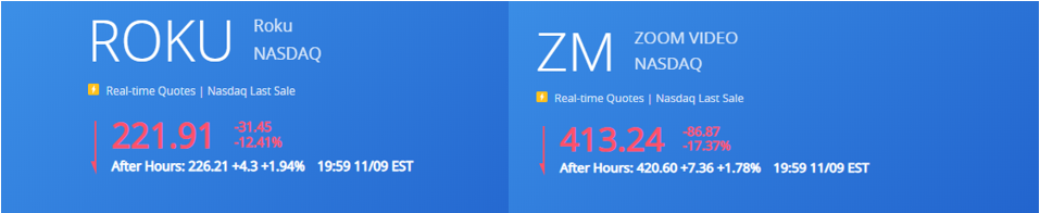 위 그림에는 없지만 언택 대표 수혜주로 꼽히는 ROKU(로쿠)와 ZOOM(줌)도 어제 일제히 하락했다.