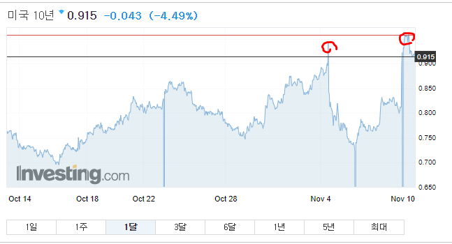 첫번째 급상승 지점은 11월 3일 대선때, 그리고 그 다음 지점은 11월 10일 어제이다.