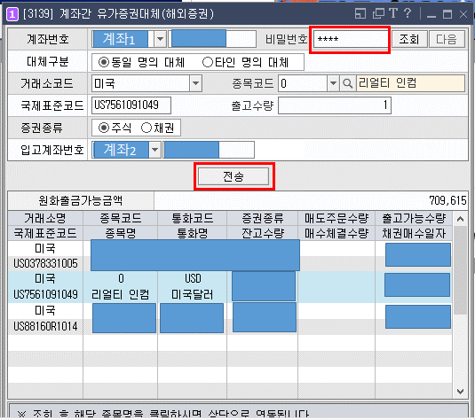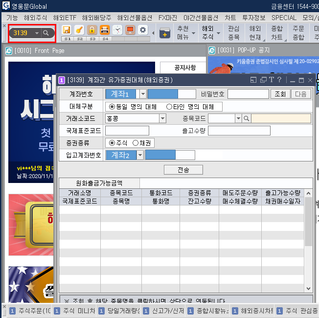 3139만 치면 엔터 누르기 전에 아래와 같이 '계좌간 유가증권대체' 창이 뜬다.