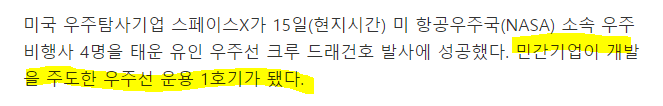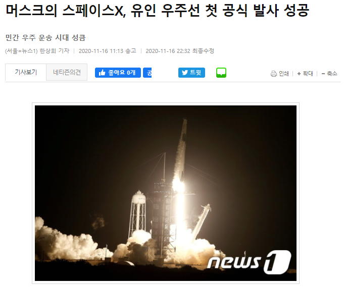 + 테슬라 관련으로, 11월 15일 민간우주기업 스페이스X가 첫 유인우주선 발사성공!