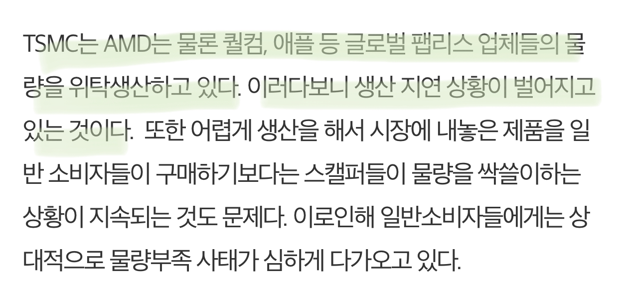 핵심내용은 밑줄만 봐도 충분하다. AMD의 GPU를 생산하는 TSMC도 일이 많다못해 감당이 안될지경으로 보인다. 파운더리 분야 자체가 진출이 힘들어 진입장벽이 높은데, 전기차에 5G 싸이클을 맞딱드리니 반도체업계는 초호황이다. 이래서 TSMC를 갑질할수 있는 을이라고 하나보다. 이렇게 여러 회사가 다 연결되는구나... 오늘 하락장이니 추매하면 딱 좋을 것 같다. 성장주에 주가가 지금 너무 높지도 않고, 산업도 호황이니 AMD는 당분간 팔지 않는 것으로...!
