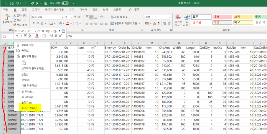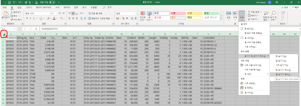 1. 보이는 첫번째 열이 전체 선택되도록 열이름 부분을 클릭후, 셀을 감싸는 두꺼운 초록색 선이 없어지도록(아래 빨간선으로 표시한것처럼) 왼쪽으로 더 드래그 한상태에서 마우스 오른쪽 버튼을 눌러 숨기기 취소를 한다.