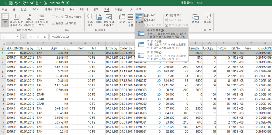 3. 이것도 안되면 틀고정이 되어있는지 확인해보고, 되어있다면 틀고정 취소를 해본다. 보통 위의 방법으로 거의 다 해결되는데, 이상하게 안되는 것들은 틀고정 취소를 하고 옆으로 이동해보면 숨겨져 있던 열들이 나타난다.