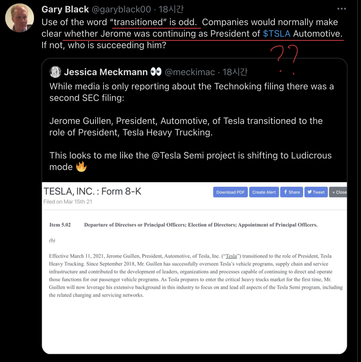 추가로, 지금 이 네이밍이 너무 쇼킹(?)한 나머지 다른 변화가 묻힌것 같은데, 자동차 부문 사장 Jerome Guillen이 헤비 트럭 사장으로 바뀌었다고... 그런데 개리 블랙이 단어 ‘transitioned’을 선택한것도 이상하고, 제롬 길렌이 헤비 트럭쪽으로 갔으면 자동차 부문에서 누가 그의 뒤를 잇는지도 궁금해하는데 말들어보니 그렇다;;;