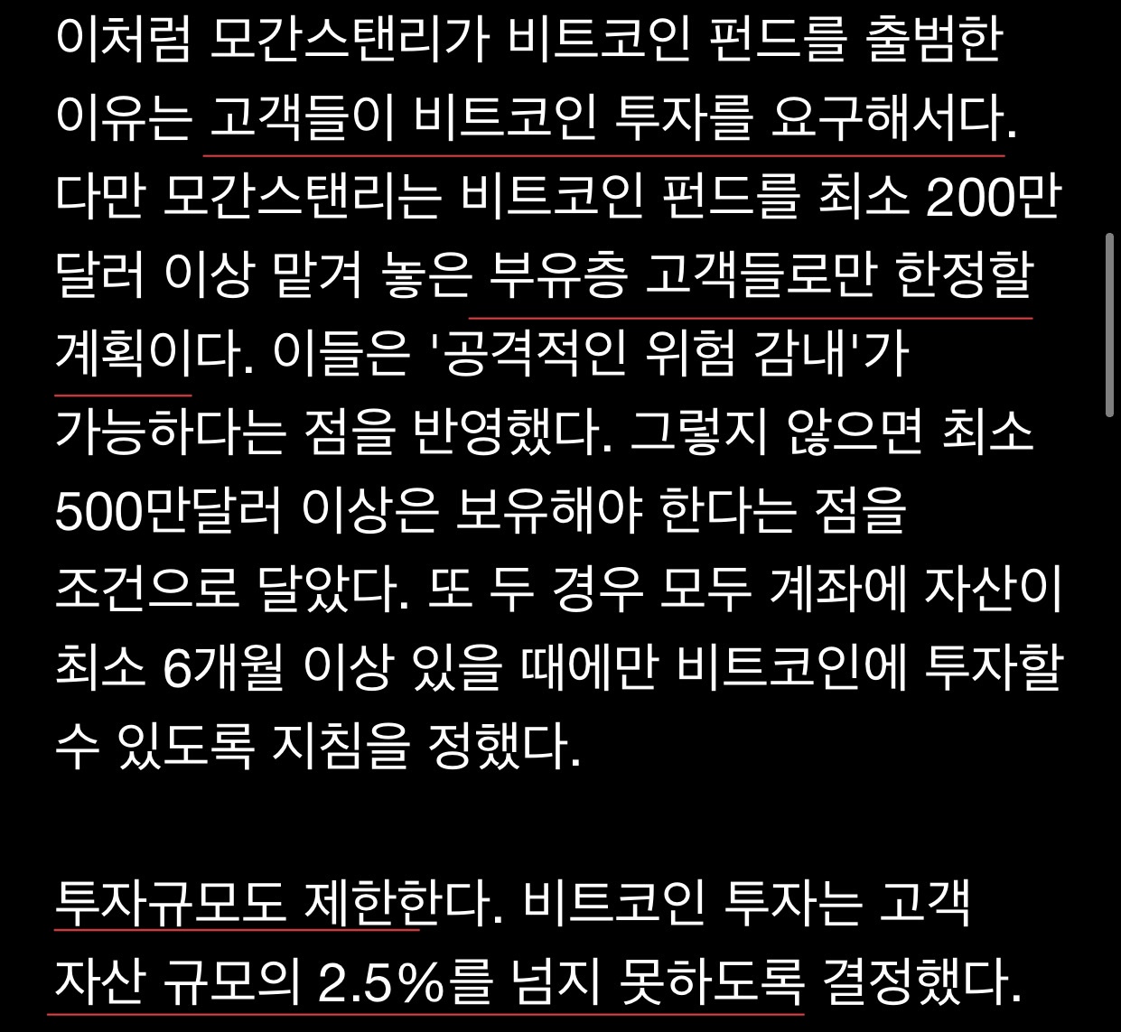 무튼, 기사 내용을 보면 그래도 아직은 보수적으로 접근해서 1) 200만 달러이상 고객에 한하여, 2) 자산 규모의 2.5% 를 넘지 않는 선에서 투자하도록 제한하는 걸 보면 변동성과 위험성에 대한 의심은 여전히 많은 것 같다.