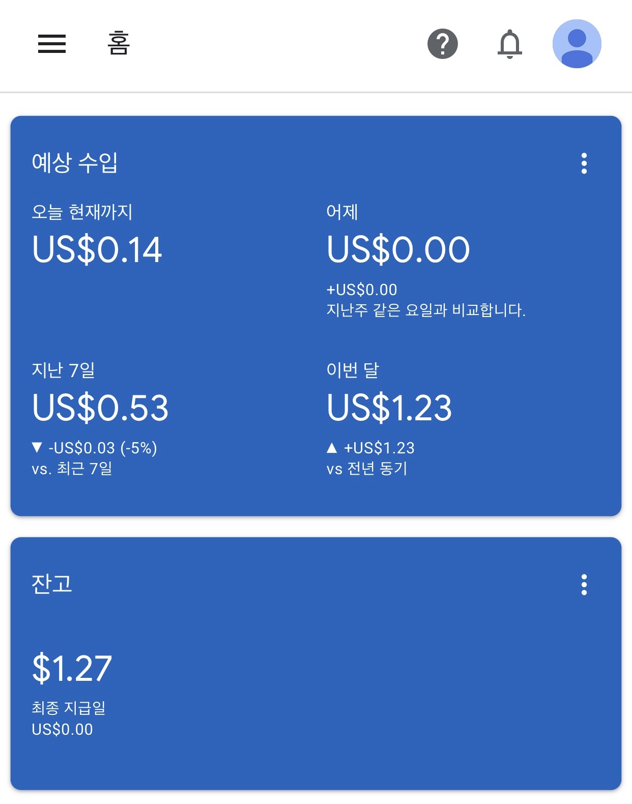 수익형 블로그가 아니고 취미형이고, 특별한 주제가 없다보니 거의 수익이 없다.